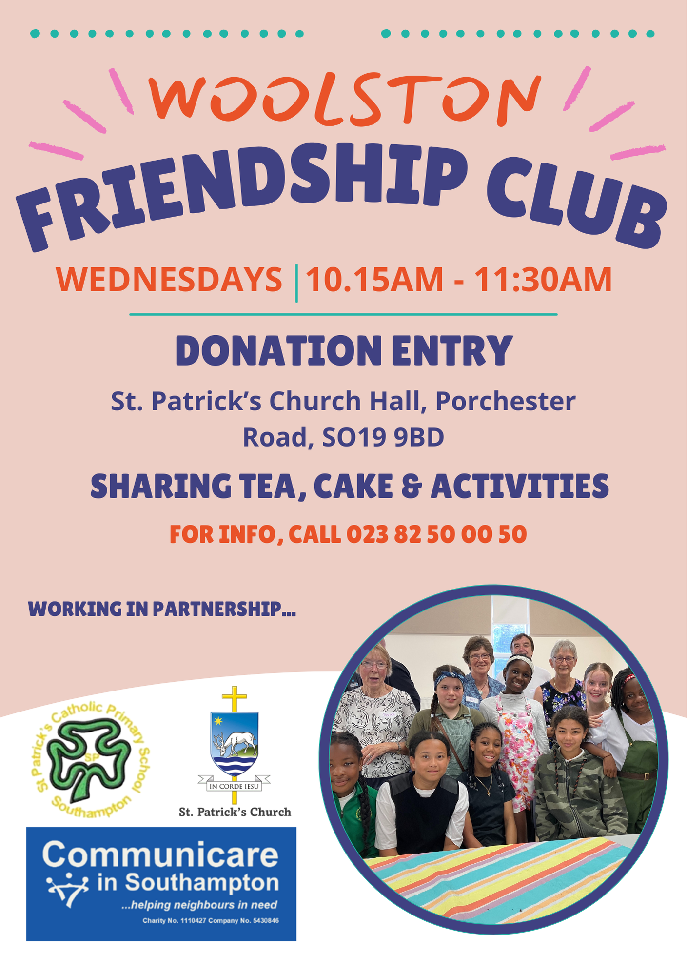 Join Communicare and the children from St Patrick's Primary School at Woolston Friendship Club, every Wednesday, 10.15 - 11.30 at St Patrick's Church Hall, Porchester Road, Woolston, SO19 9BD.