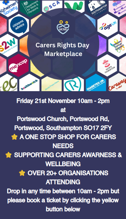 Join Unpaid Carers Support Southampton for their Carer's Rights Marketplace, Friday 21st November, 10am - 2pm, Portswood Church.